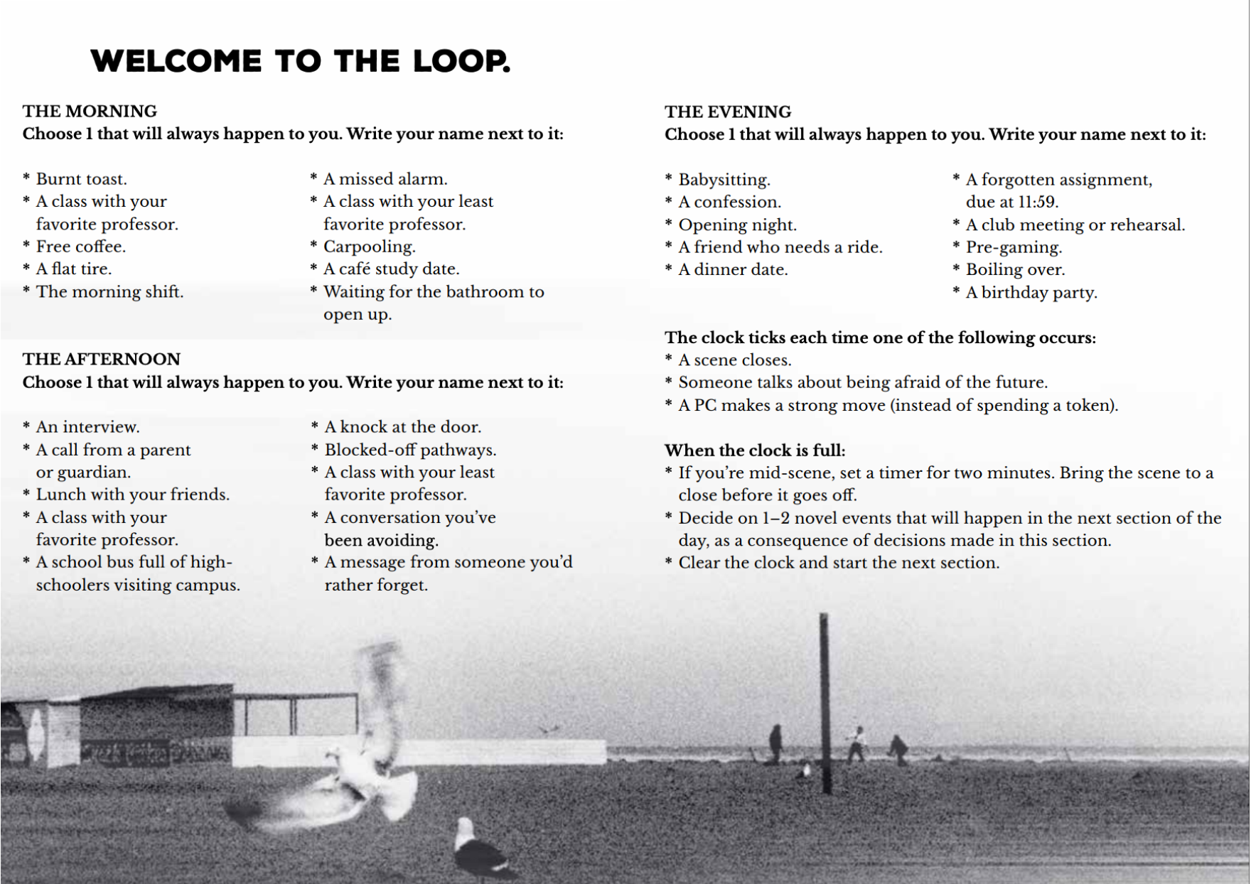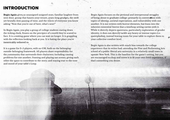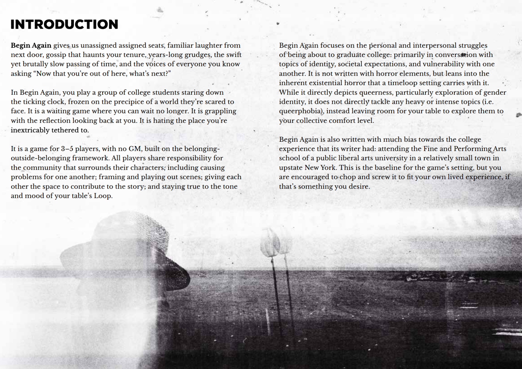 Begin Again is a GM-less tabletop roleplaying game for 3–5 players, built on the belonging outside belonging framework. All players share responsibility for the community that surrounds their characters, including causing problems for one another; framing and playing out scenes; giving each other the space to contribute to the story; and staying true to the tone and mood of your table’s Loop.